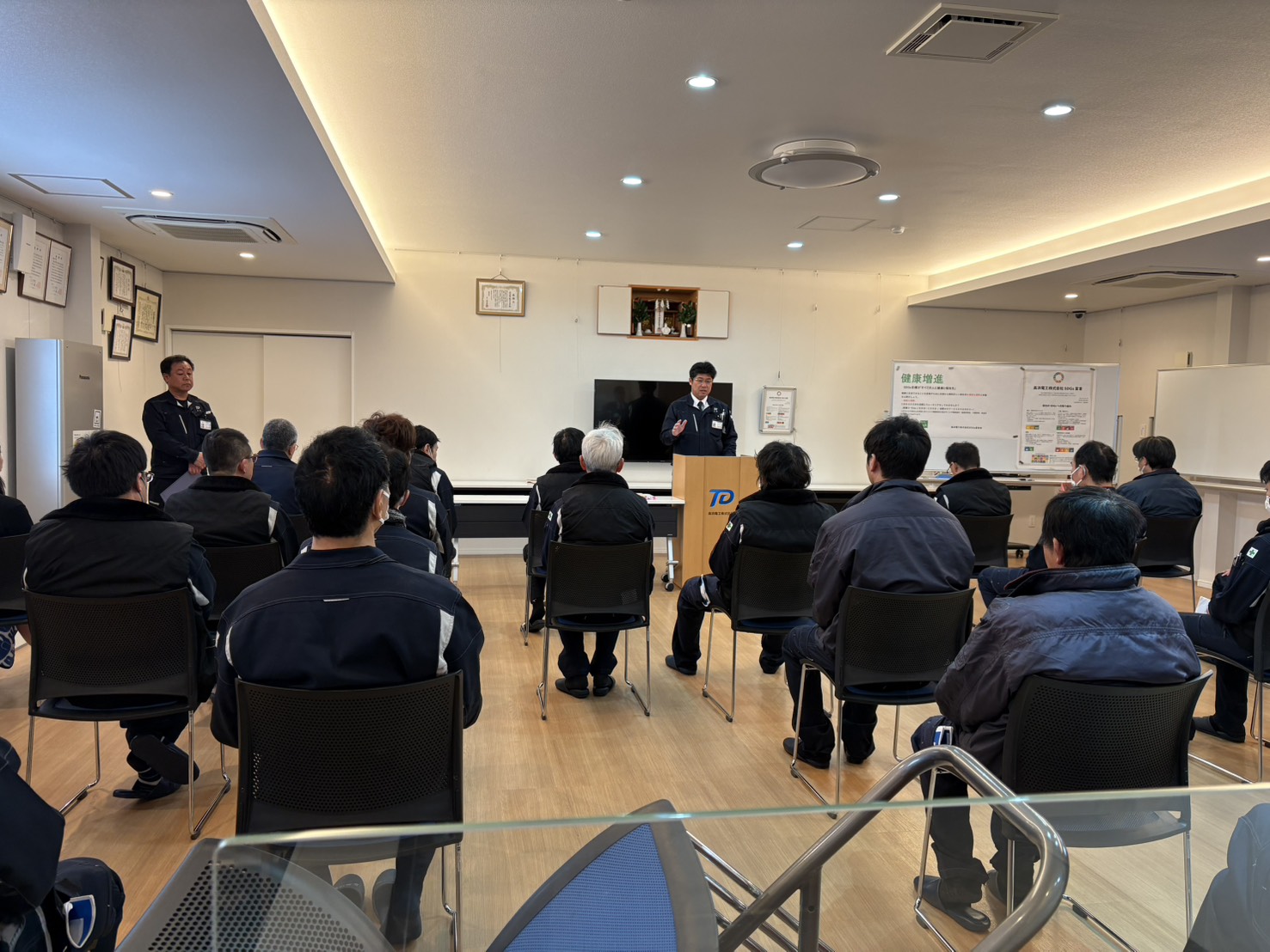 新体制になって初めての全体朝礼でした。安藤社長から株主総会や決算の報告、これから経営指針などのお話がありました。100年企業を目指す私たちには先人たちや志半ばで散った仲間のバトンも託されています。今年も1年社員全員、安全第一で頑張りましょう!!