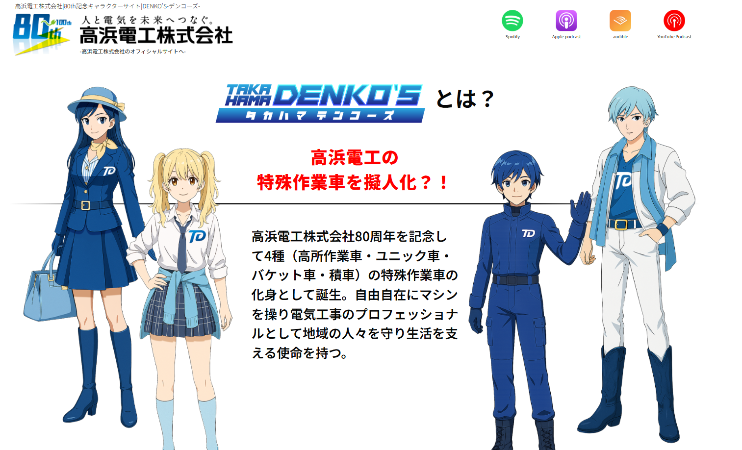 創業80周年を記念して特殊作業車をモデルにしたボイスドラマを作成しました。 キャラクターを通じて電気工事や私たちのことを身近に感じていただければ幸いです。