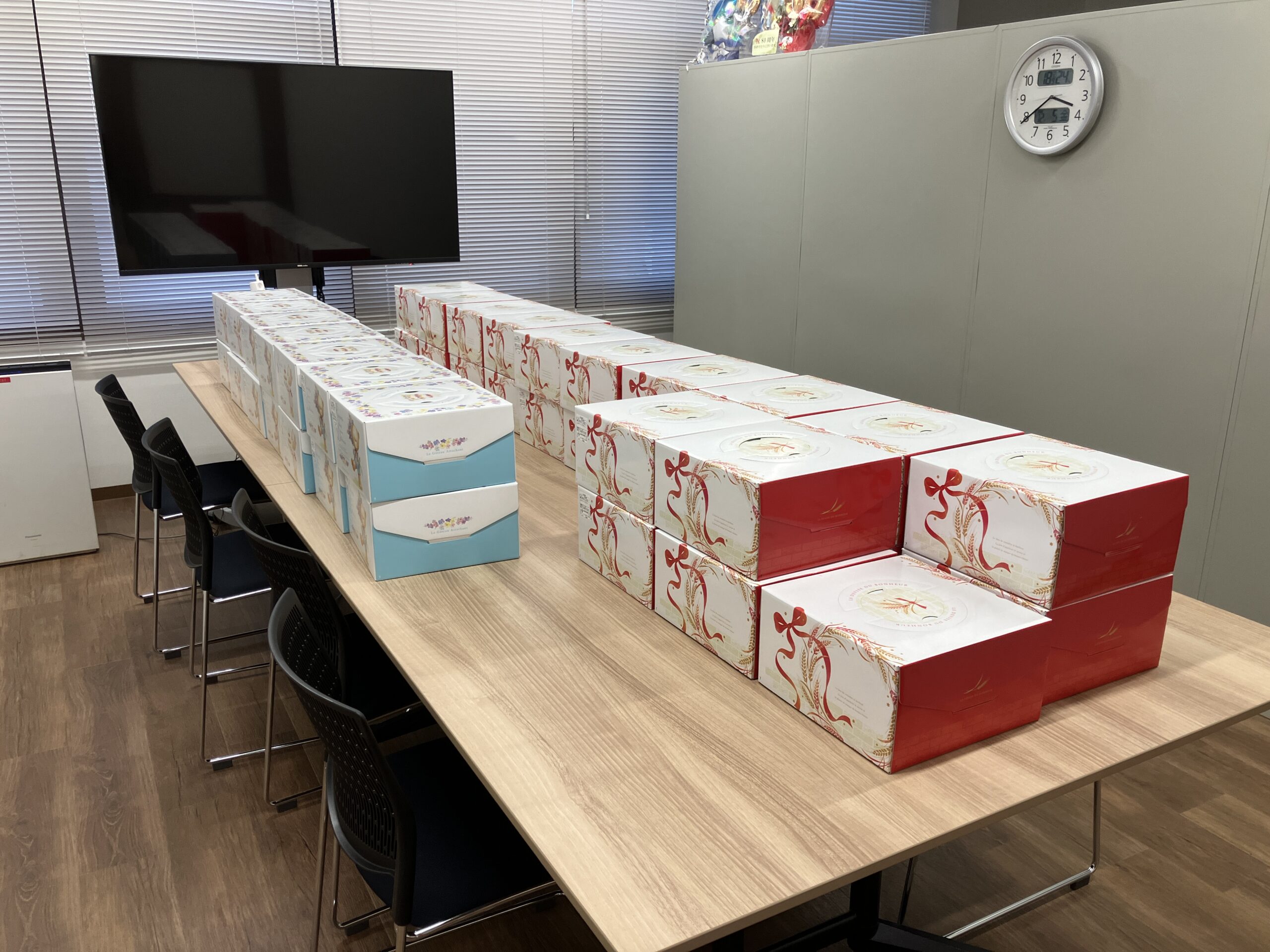 今年も暖冬の影響でイチゴの生育が悪く、11月19日のノー残業デーでは恒例のホールケーキをお配りする事ができませんでした。12月に入り、楽しみにしている家族のためにカラフルなマカロンと一緒に配布をしました。もう師走です、残り少ない1年を安全無事故で頑張りましょう!!