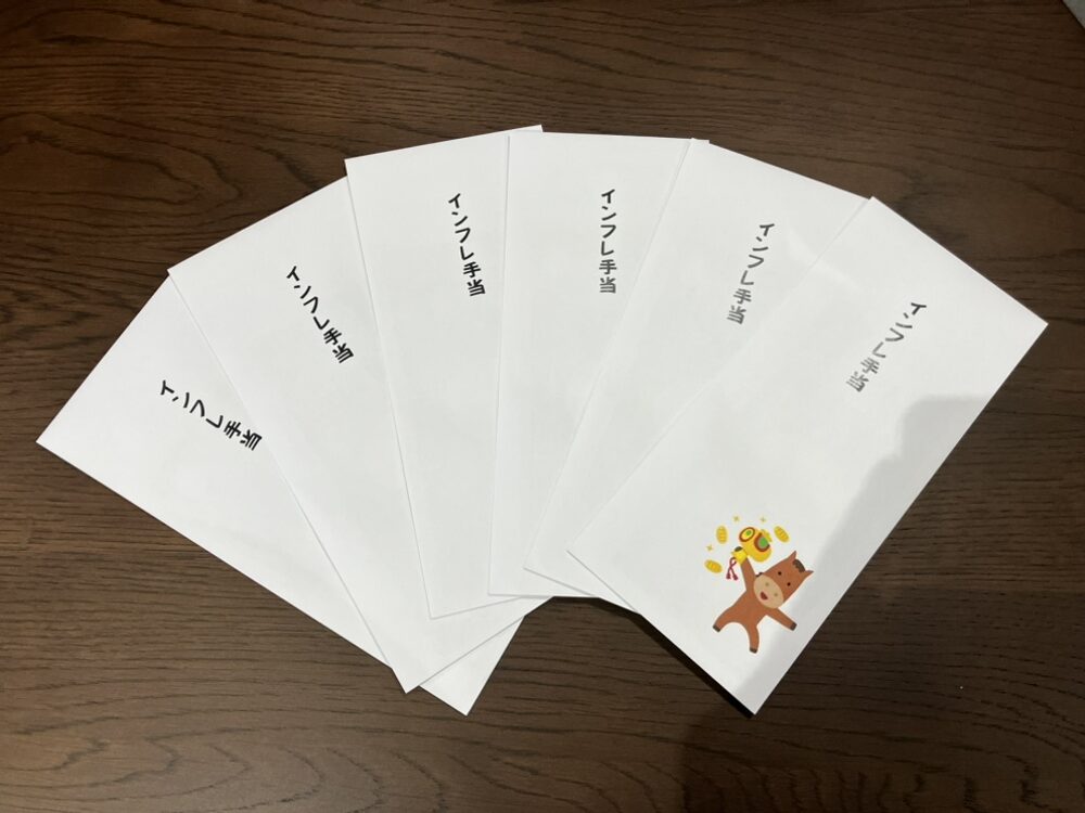 インフレ手当を今年も支給しました。物価高騰の中、少しでも家計のお役に立てていただきたい。同時にタカハマデンコーズのクオカード2枚も社員全員にお渡ししました。