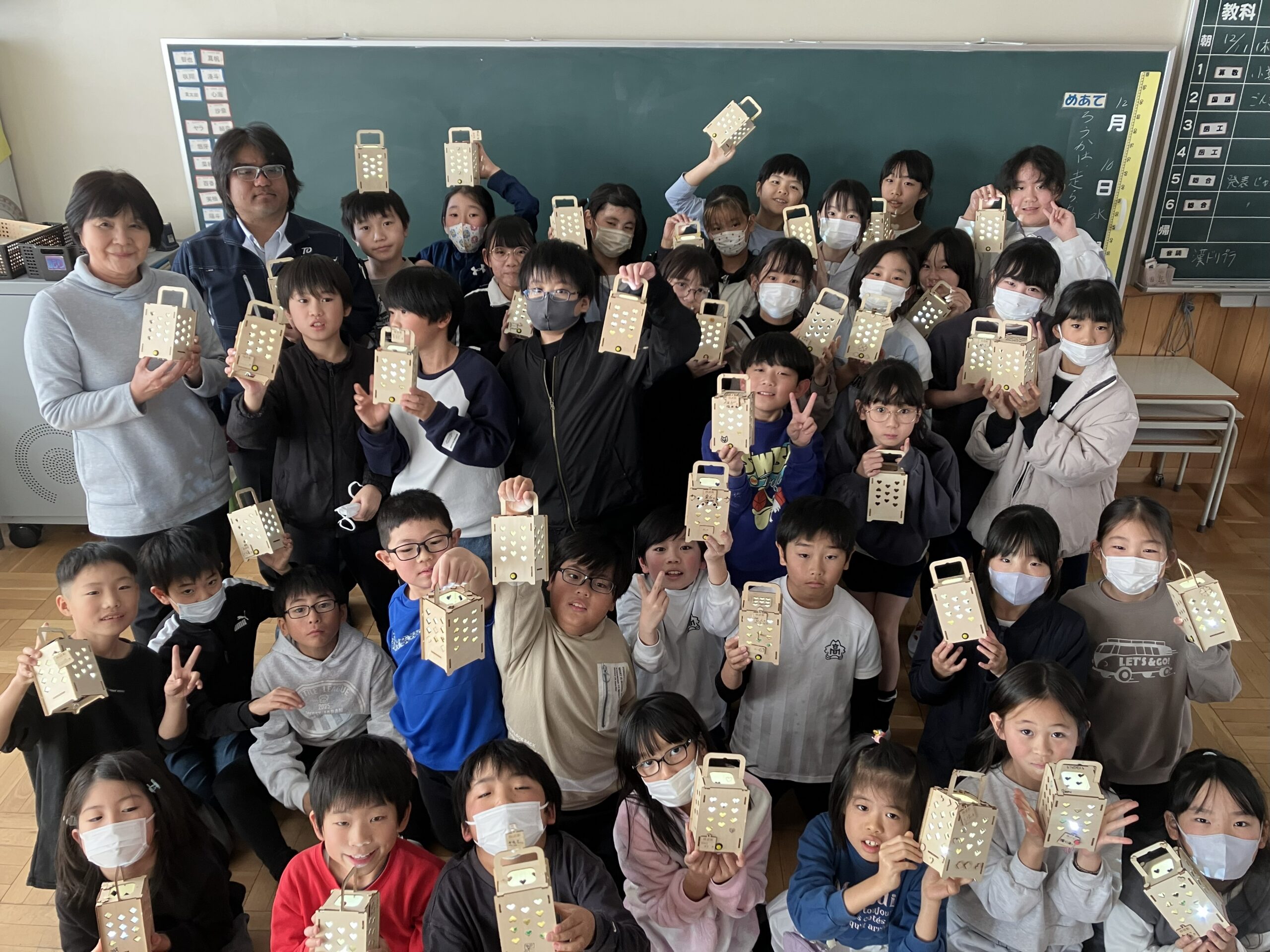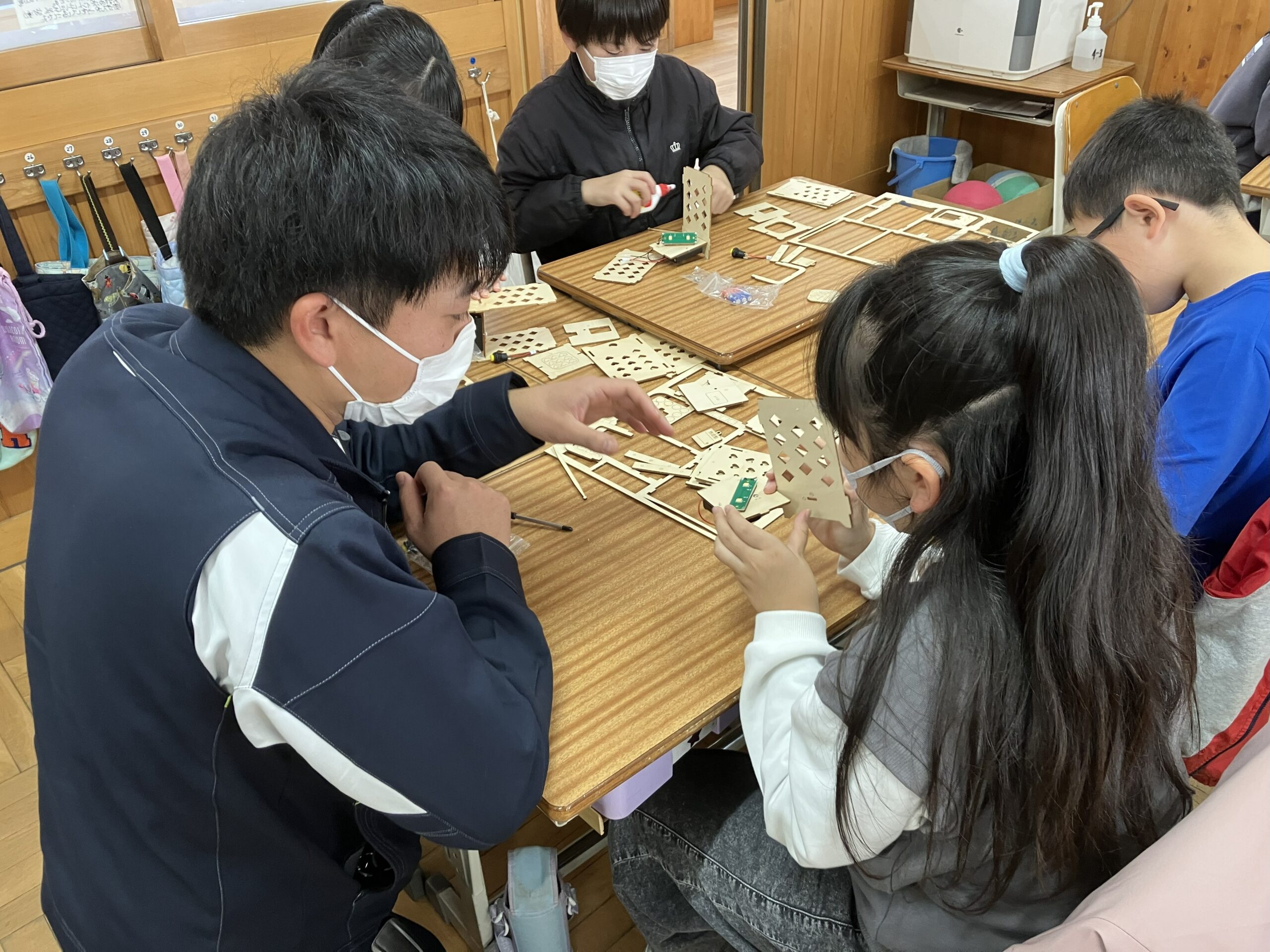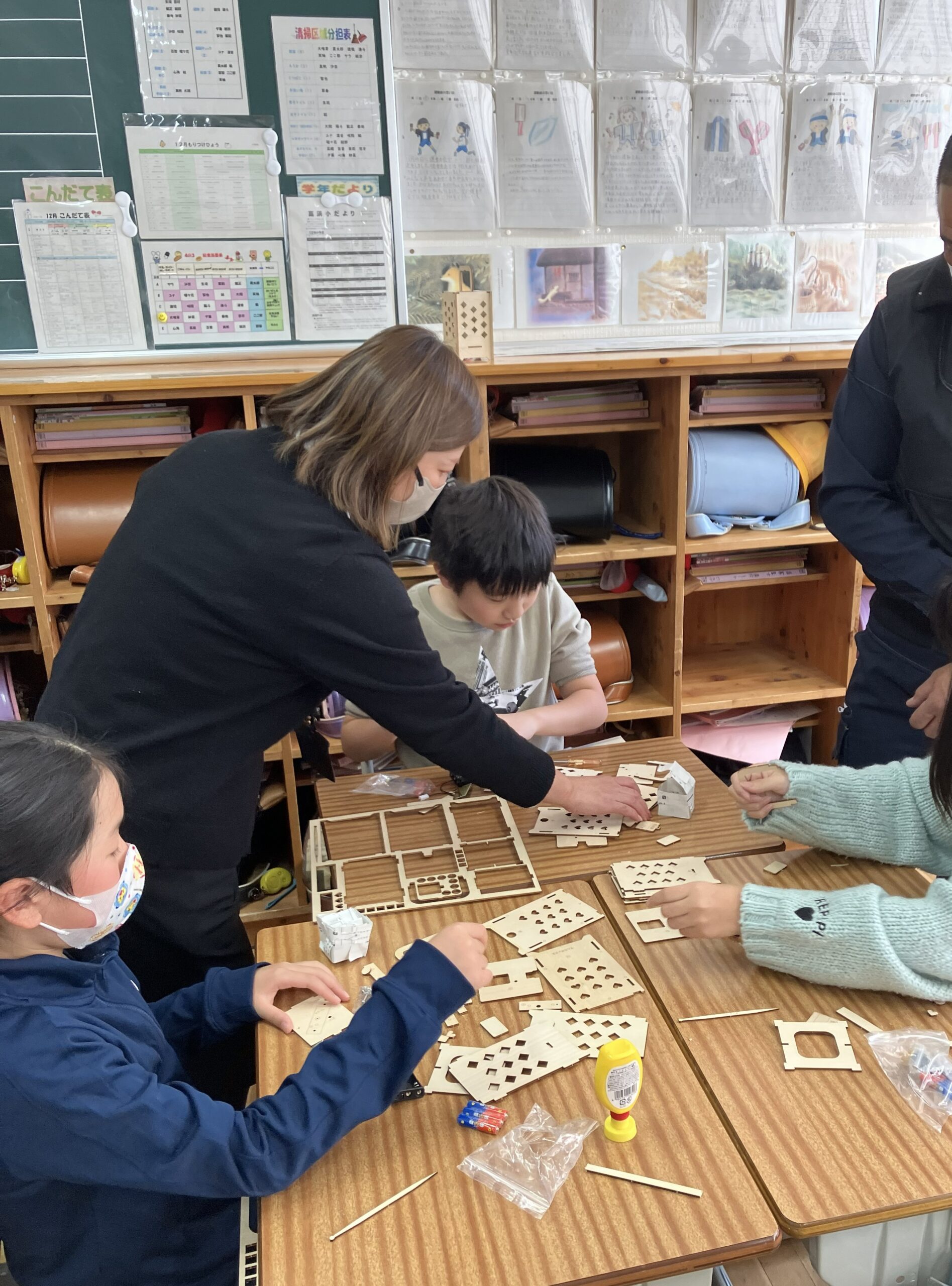 11月の出前授業(工作体験)の時にインフルエンザで学級閉鎖だったクラスと欠席していた児童を対象に追加の出前授業をしました。今回は事務員さんも加わりサポート。真剣な眼差しで取組み、完成してとても嬉しそうな子ども達の笑顔が印象的でした。