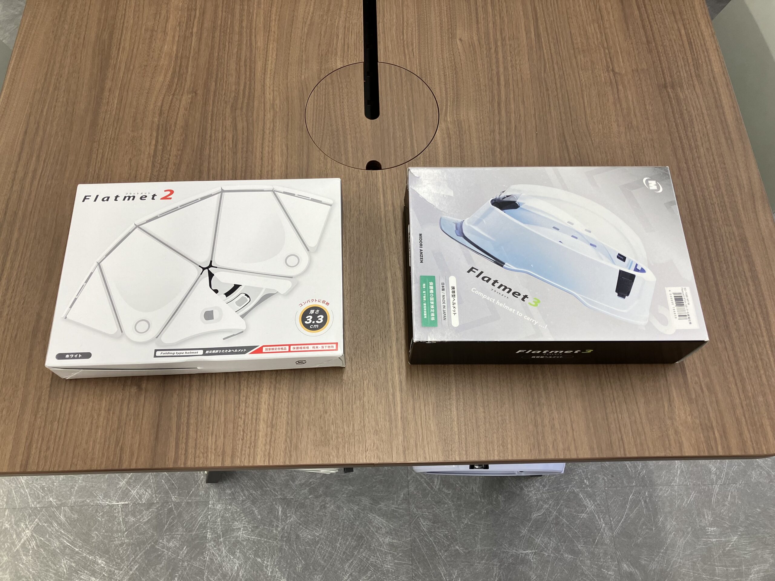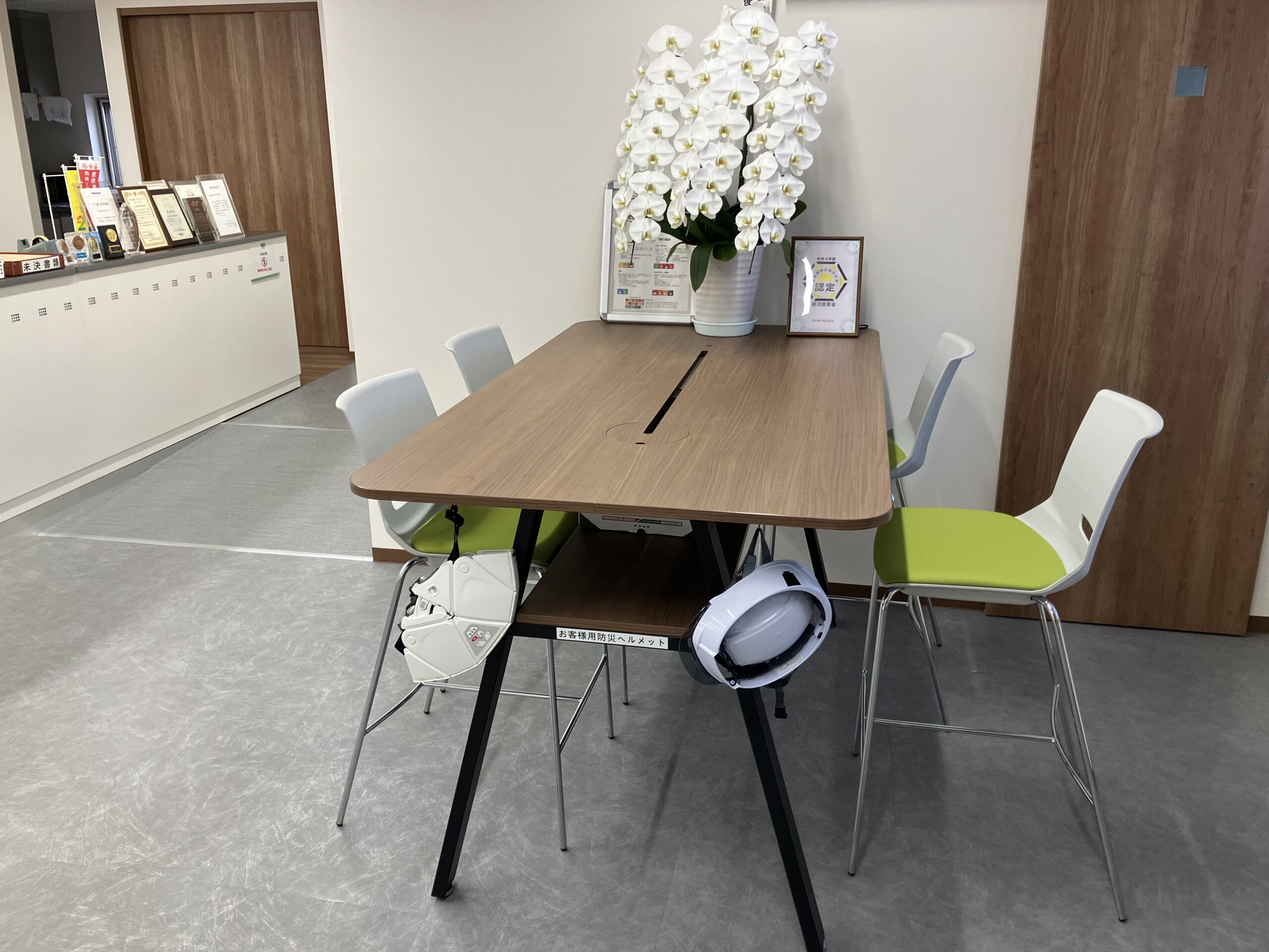 ミーティングデスクに防災用折りたたみヘルメットの配備を完了いたしました。